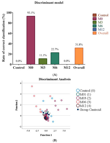 Discriminant analysis representing the gut microbiomes of healthy control participants and bariatric surgery patients before surgery and 3 months, 6 months, and 12 months after surgery. The rates of correct classification (A) and a scatter plot (B) are shown. (M0: pre-surgery; M3: 3 months post-surgery; M6: 6 months post-surgery; M12: 12 months post-surgery).