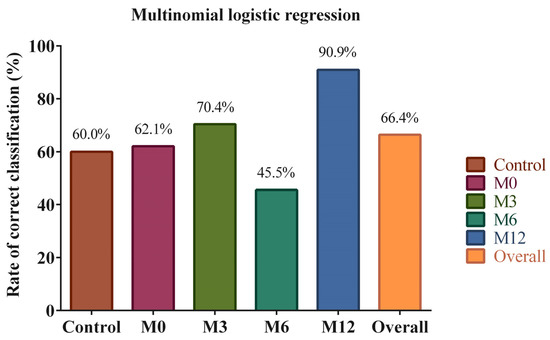 Rates of correct classification from a multinomial logistic regression model representing the gut microbiomes of healthy control participants and bariatric surgery patients before surgery and 3 months, 6 months, and 12 months after surgery. M0: pre-surgery; M3: 3 months post-surgery; M6: 6 months post-surgery; M12: 12 months post-surgery.