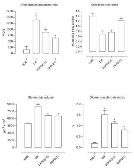 The kidneys from DR treated with saline showed a significantly higher value (percentage of kidney weight with respect to body weight) compared to the healthy animals (0.9 ± 0.06 in DR versus 0.5 ± 0.04 in NDR, p < 0.05). DHPG did not significantly modify the kidney’s dry weight of diabetic animals (0.8 ± 0.06 and 0.8 ± 0.05 with 0.5 and 1 mg/kg/day, respectively).