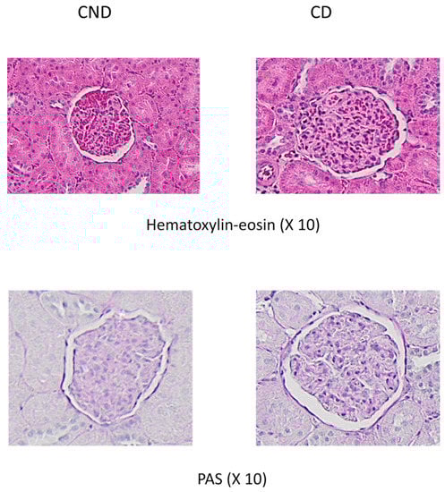 To calculate the glomerulosclerosis rate (GMS), sections stained with PAS (50 glomeruli/section) were used. After assessing the area of each glomerulus, the positive PAS surface was quantified via image analysis using the formula: [PAS(+)A (µm2)/GA (µm2)] × 100 (GMS: percentage of glomerular area with PAS(+) material; PAS(+)A: area occupied with PAS(+) material in a glomerulus; GA: area of a glomerulus).