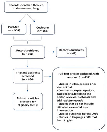 The study was conducted according to the PRISMA [40] statement recommendations. We searched PubMed and the Cochrane Library for relevant articles in October 2022. The search strategy was based on the following keywords: “citicoline”, “cytidine diphosphate choline”, “choline”, “cognitive impairment”, “cognitive decline”, “cognitive dysfunction”, “Alzheimer’s disease”, and “vascular dementia” (Table S1). We restricted the search to clinical trials using “Clinical Study”, “Clinical Trial”, “Randomized Controlled Trial” as a filter, and limited the search to articles published in English between 2010 and September 2022.