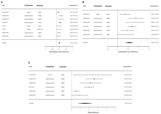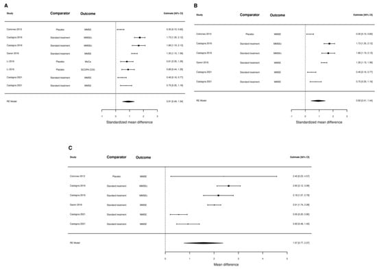Forest plot summarizing all studies (panel (A)), only observational studies (panel (B)), and only studies using MMSE as outcome measure (panel (C)). SD were calculated assuming a large correlation coefficient (r = 0.9).