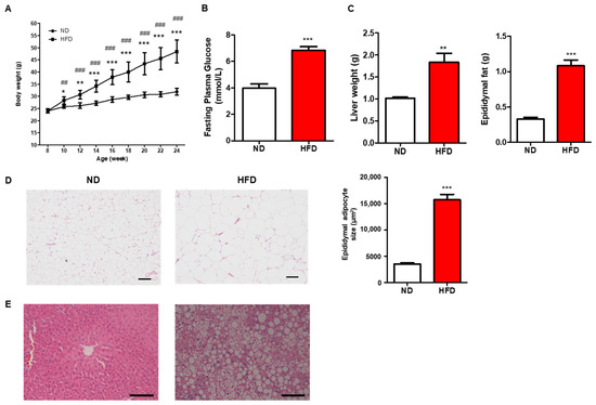 All mice were weighed biweekly from eight-week-old to the end of the experiments. The body weight of mice in both ND and HFD groups did not show any difference at the beginning of the experiment, while long-term HFD consumption induced significantly increased body weight from the second week of treatment (Figure 1A). Also, the fasting glucose and tissue weight, including liver and epididymal fat, were significantly higher in the HFD group than in ND (Figure 1B,C). Consistent with the changes in epididymal fat and liver, increased adipocyte size and aggravated fatty liver by H&E staining were observed (Figure 1D,E). Those results indicate that prolonged HFD intake induced metabolic disorders.