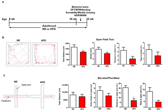 Effect of long-term HFD consumption on anxiety- and depression-like behavior in mice. Experimental design (A). Representative movement trace images, total distance, speed, percentage of distance in center, and time in center in Open Field Test of ND- and HFD-fed mice (B). Representative movement trace images, total distance, entry times in open arm, percentage of distance in open arm, and time in open arm of Elevated Plus Maze test (C). ND, normal diet; HFD, high-fed diet. Values are shown as the mean ± SEM. t-test was performed. * p < 0.05; ** p < 0.01.