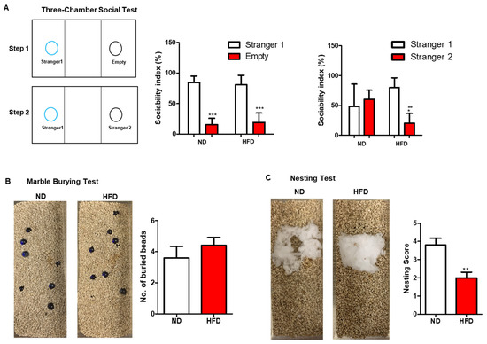 Effect of long-term HFD consumption on autism-like behavior in mice. Schematic diagram, sociability index between stranger 1 and empty cage, and sociability index between stranger 1 and stranger 2 of three-chamber social test (A). Representative images and number of burying beads in marble burying test (B). Representative images and nesting score in nesting test of ND- and HFD-fed mice (C). Values are shown as the mean ± SEM. t-test or two-way ANOVA with a post hoc Tukey test was performed. * p < 0.05; ** p < 0.01; *** p < 0.001 vs. ND, ## p < 0.01 vs. stranger 1.