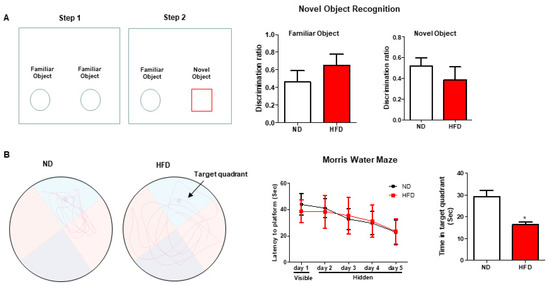 Effect of long-term HFD consumption on learning and memory in mice. Schematic diagram, discrimination ratio between familiar objects, and discrimination ratio between familiar object and novel object in Novel Object Recognition (A). Representative movement trace images, latency to platform from day 1 to day 6, and time spent in target quadrant on day 6 in Morris Water Maze (B). Values are shown as the mean ± SEM. t-test or one-way ANOVA with a post hoc Tukey test was performed. * p < 0.05 vs. ND.