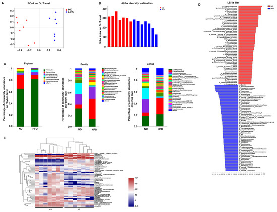 Effect of long-term HFD consumption on gut microbiota in mice. Principal coordinates analysis plot of unweighted UniFrac distances (A), Alpha diversity in ND- and HFD- fed mice using Sobs index on OUT level (B), Community alterations at Phylum, Family, and Genus level (C), Linear discriminant analysis (LDA) effect size showing the most differentially significant abundant taxa (D), Community heatmap analysis on Genus level in mice (E).