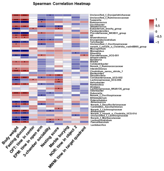 Effect of long-term HFD consumption on functions of gut microbiota in mice. Spearman correlation heatmap showing the correlations between neurobehavioral alterations and specific gut flora. * p < 0.05; ** p < 0.01; *** p < 0.001.