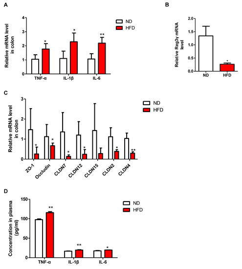Due to the high content of fat and low content of fiber in HFD, mice consuming long-term HFD exhibited significantly decreased length of colon compared with that in ND-fed mice (Figure 7A). Plasma endotoxin level was notably increased in HFD mice in comparison to that in control mice (Figure 7B). Furthermore, the length of villi and the thickness of the mucus layer in the proximal colon were significantly reduced in HFD mice than in ND-fed mice. Interestingly, mRNA levels of the genes related to inflammation (TNF-α, IL-1β, and IL-6) were significantly higher in HFD mice than those in the ND group (Figure 8A). This observation was further verified by determining the protein levels of TNF-α, IL-6, and IL-1β in the plasma, which showed that their expressions were significantly increased in the HFD group than those in ND-fed mice. On the other hand, mRNA levels of antimicrobial peptide Reg3γ and the genes involved in tight junction proteins, including ZO-1, occludin, CLDN7, CLDN12, CLDN15, CLDN2, and CLDN4, were decreased in HFD mice (Figure 8B,C). Altogether, these results demonstrated that prolonged HFD intake could impair gut barrier integrity and induce inflammatory responses in the colon.