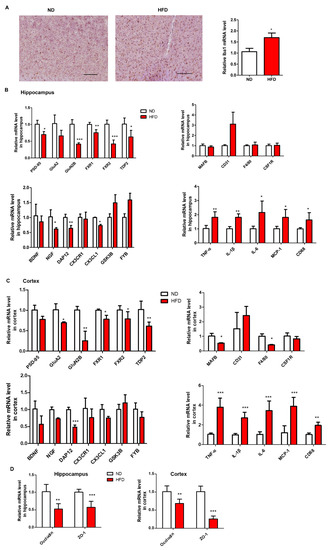 In this study, the protein level and relative mRNA expression of ionized calcium binding adaptor molecule 1 (Iba-1), a marker of activated microglia, was measured using IHC and RT-PCR, respectively [25]. The results showed that long-term HFD consumption could significantly induce the expression of Iba-1 in the cortex (Figure 9A). The mRNA levels of genes related to synaptic-plasticity (PSD-95 and FXR1), neuronal development (FXR2 and TDP2), NMDA receptor GluN2B, and AMPA receptor GluA2 in the hippocampus and prefrontal cortex of HFD-fed mice were lower than those in mice fed with ND (Figure 9B,C). Moreover, the mRNA levels of the genes involved in microglia maturation (MAFB, CD31, F4/80, and CSF1R), microglia-neuron interaction (BDNF, NGF, DAP12, CX3CR1, and CX3CL1), microglia activation (GSK3B and FYB), neuroinflammatory cytokines (TNF-α, IL-1β, IL-6, MCP-1, and CD-68) were also evaluated in hippocampus and prefrontal cortex. Prolonged HFD treatment lowered the levels of BDNF, NGF, DAP12, and CX3CL1 but increased CD31, TNF-α, IL-1β, IL-6, MCP-1, and CD-68 in both hippocampus and prefrontal cortex (Figure 9B,C). Apart from the changes in microglia and synaptic markers, the mRNA levels of tight junction proteins involved in BBB were also evaluated. The results revealed that the expression levels of ZO-1 and occludin in the hippocampus and prefrontal cortex were attenuated in mice fed with HFD for a long time than in mice fed with ND (Figure 9D). These findings indicated that long-term HFD could result in synaptic impairment, disruption of microglia function, and decreased expression of tight junction proteins in the hippocampus and prefrontal cortex.