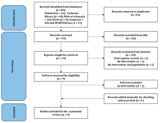 This is a systematic review of randomized controlled studies with a priori registered protocol on the Open Science Framework (OSF) “https://doi.org/10.17605/OSF.IO/85SRU (accessed on 03 October 2022)”. The systematic review was conducted following the 2020 Preferred Reporting Items for Systematic Reviews and Meta-Analyses (PRISMA) [] and the PRISMA implemented in Exercise, Rehabilitation, Sports medicine and SporTs science (PERSiST) guidelines [].
