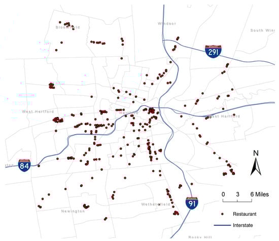 The mobility data were sourced from SafeGraph, a data company that aggregates anonymized location data from mobile devices to provide insights into physical places [,]. We used the Safegraph’s Core Places and Patterns datasets, which aggregated data from approximately 10% of all the mobile devices in the US and contained information about the number of visits from people’s home census tract to each point of interest (POI). The data were made publicly available during the early stage of the Coronavirus Disease 2019 (COVID-19) pandemic. SafeGraph uses a validated algorithm to determine visits to POI, and the duration of the visit must last for at least 4 minutes to count as a visit to a given POI [,]. SafeGraph defines a person’s “home” to be the location where the mobile device is detected the most at night (i.e., from 18:00 to 07:00) over a 6-week period, and each location is defined at the Geohash-7 level (153 × 153-m grid). According to SafeGraph, no privacy rights were violated during data collection; the data do not contain individual information; and the data cannot be “de-anonymized” using any known method of re-identification []. Previous studies showed that the mobile-device sample in SafeGraph is generally representative of the general population in terms of sociodemographic variables (e.g., racial/ethnic composition, educational attainment, and income) and the overall US Census population count [,]. Using SafeGraph data, we included all restaurant POIs in the Greater Hartford region. After validating the restaurant locations and removing duplicates, we included a total of 396 restaurants, where 69 were full-service restaurants (defined by the North American Industry Classification System [NAICS] code 722211) and 327 were limited-service restaurants (NAICS code 722513). A cross-validation with restaurant directories from Yelp and Google Place showed that the SafeGraph data included more than 80% of the restaurant POIs in the study area. The 396 restaurants included in this study were visualized in ESRI ArcGIS Pro, as shown in Figure 1.