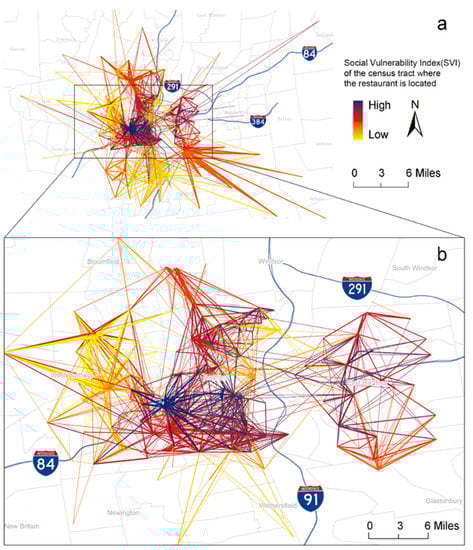Furthermore, Figure 2 shows that there was considerably less mobility in terms of restaurant visits in more socially vulnerable areas (i.e., higher SVI, dark-colored lines), and that restaurants in these high SVI areas mostly attracted visitors from nearby. However, a further spatial descriptive analysis showed that even in the top 10% most socially vulnerable areas, there were still considerable journeys originating from external tracts: only 9.7% (SD = 4.9%) of the customers originated from the restaurant’s census tract; on average, 28.7% (SD = 9.0%), 39.8% (SD = 6.1%), 14.9% (SD = 3.5%), and 10.3% (SD = 4.4%) of customers originated from within a radius of 1, 1 to 5, 5 to 10, and 10 to 20 miles, respectively, of the restaurant; on average customers, still traveled a median distance of 2.0 [IQR = 1.6–2.8] miles to patronize the restaurant.