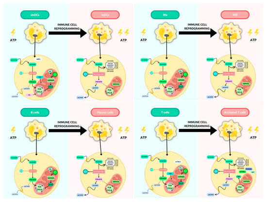 The main function of the immune system is defense against foreign and/or malignant cells through nonspecific or specific mechanisms that induce innate and adaptative immune responses, respectively. For this, professional antigen-presenting cells (APCs), such as dendritic cells (DCs), macrophages, and B lymphocytes, after identifying external or internal danger signals, i.e., pathogen-associated molecular patterns (PAMPs) or danger-associated molecular patterns (DAMPs), acquire an activated state [8]. Moreover, during this process, APCs migrate to lymphatic nodes to interact with T lymphocytes and induce a specific effector response [9], with activation of intracellular signaling cascades, leading to the induction of a general proinflammatory response [8]. This change of state, which includes phenotypical and functional modifications from the resting state to the activated and effector state from these immune cells, supposes an increase in their energy requirements that affect their intracellular metabolism [10]. This implies deep changes in different metabolic pathways, such as glycolysis, the tricarboxylic acid (TCA) or Krebs cycle, the pentose phosphate pathway (PPP), fatty acid (FA) oxidation (FAO), fatty acid synthesis (FAS), amino acid metabolism, and oxidative phosphorylation (OXPHOS) [10,11].