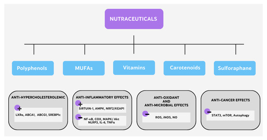 Nutraceuticals have demonstrated a wide range of health effects, such as anti-inflammatory, anticancer, antioxidant, and prebiotic effects and their regulation of lipid metabolism [141]. Next, we focus on those nutraceuticals that have shown immunometabolic abilities (Figure 3).