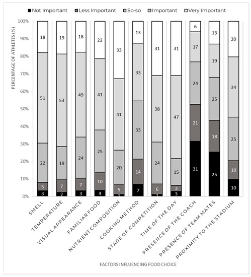 The time of the day and the nutrient composition were the factors that athletes reported to be more important, with 78 and 74% of athletes, respectively, rating them as important or very important. In contrast, the presence of the coach and the presence of teammates were considered less relevant, with 53% and 43% of athletes, respectively, rating them as not important or less important (Figure 1). Competition-related factors were considered relevant for athletes’ food choices, with the stage of competition and the proximity to the stadium being rated as important or very important by 69% and 63% of athletes, respectively. Sprinters were more likely to rate the visual appearance as important or very important, compared to throwers (77% vs. 50%; p = 0.03) and jumpers (77% vs. 49%; p = 0.015). Distance runners were more likely to rate the stage of competition as important or very important, compared to throwers (81% vs. 62%; p < 0.001). Athletes who had past international competition experience were more likely to consider the nutrient composition (78% vs. 51%; p < 0.001) and the cooking method (49% vs. 33%; p = 0.007) important or very important, compared to those who did not have this experience. There was no relationship between sex and any factor influencing food choice during the competition (p > 0.05).