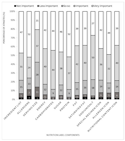 Concerning nutrition label components (Figure 2), protein (89%) and carbohydrates (89%) were the categories being rated as important or very important by a greater number of athletes, followed by sugar (84%) and energy (83%). On the other hand, serving size was the component which fewer athletes (58%) rated as important or very important. However, athletes who have had past international competition experiences were more likely to consider the serving size as important or very important, compared to those who have not had the experience (62% vs. 32%; p = 0.021). Middle-distance runners were more likely to consider the presence of the protein content in a nutrition label as important or very important when compared to sprinters (98% vs. 80%; p = 0.03). There was no relationship between sex and the opinion on how important the presence of any component of a nutrition label was (p > 0.05).