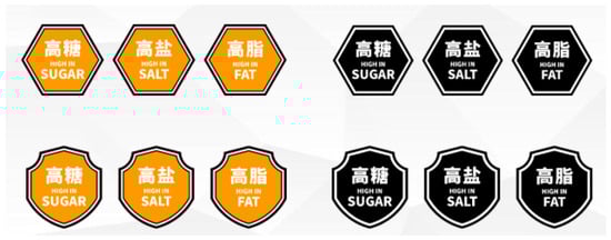 Consumption of unhealthy food is a modifiable risk factor. Food labeling could reduce the information asymmetry between consumers and food producers to help consumers better understand the nutritional information of food and thus make health-conscious food choices [8,9]. As a simpler, more attention-grabbing form of communicating the nutritional content and relative healthfulness of food products, front-of-package (FOP) labeling is recommended by the World Health Organization (WHO) as one of the “Best Buy” (i.e., cost-effective) interventions to combat NCDs [10,11]. FOP labels have been adopted by many countries, and these may help consumers make healthier food choices [12,13]. There are two categories of FOP labels: reductive labels (e.g., Guideline Daily Amounts (GDA)) and interpretive labels (e.g., Health Star Rating, Multiple Traffic Lights (MTL), and warning labels (WLs), etc.) [14]. As a relatively new format, WLs have been proposed that only highlight key nutrients that have exceeded recommended levels, with the aim of alerting the population about the negative health effects that these excessive nutrients may have [15]. Multiple scientific studies have shown that, compared to other FOP labels, WLs are the superior option for capturing consumers’ attention, as they are easy to understand across various populations, helping consumers identify products high in nutrients of concern, and thus discouraging them from purchasing these products. WLs are seen as an effective FOP labeling system to inform consumer decisions [15,16,17,18,19,20,21,22]. This system has been implemented across Chile, Peru, and Mexico, and passed in Uruguay and Brazil. Results from Chile showed that policies including warnings were effective in significantly reducing the purchase of sugar-sweetened beverages [23] and promoting reformulation of products to reduce sugar and sodium content [24].
