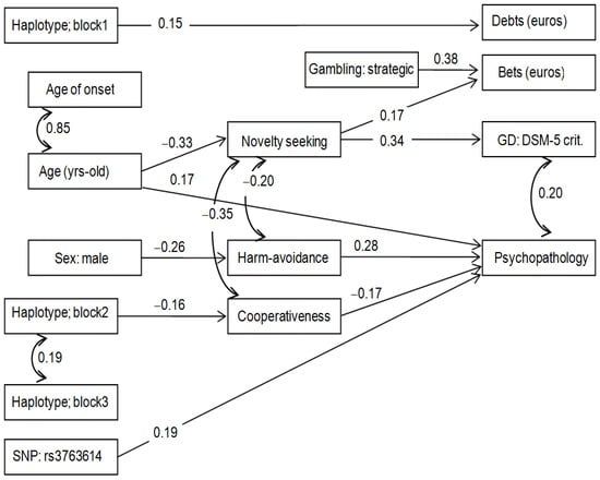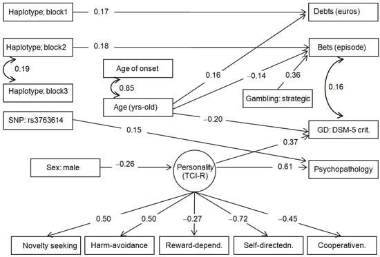 The risk group for haplotype block 1 predicted higher debts due to gambling behavior, the group carrying the non-protective allele for haplotype block 2 predicted higher bets in the gambling episodes, and the risk group for SNP rs3763614 predicted worse psychopathological state. Within the SEM, no direct effect was observed for haplotype block 3 (this predictor only significantly correlated with haplotype 2), and SNP rs11140783 was excluded since there were no significant associations within the structural paths. No mediational links appeared between the genetic variables with socio-demographics (sex and age), personality and gambling-related measures.