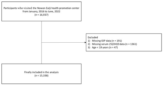 This retrospective, cross-sectional study used data from the health promotion center of an educational hospital. From January 2016 to June 2022, a total of 16,937 participants visited and received a health examination at the Nowon Eulji Health Promotion Center. The exclusion criteria were as follows: (1) those with missing intraocular pressure data (n = 191), (2) those with missing serum 25(OH)D data (n = 1361), and (3) those aged < 19 years (n = 47). We finally analyzed the data from 15,338 participants (Figure 1).