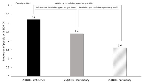Figure 2 shows the proportion of people with EIOP according to the 25(OH)D status. The proportion of people with EIOP was highest in the 25(OH)D deficiency group, followed by the 25(OH)D insufficiency and 25(OH)D sufficiency groups (3.2% in the 25(OH)D deficiency group, 2.4% in the 25(OH)D insufficiency group, and 1.6% in the 25(OH)D sufficiency group, overall p < 0.001). Pairwise comparisons revealed significant differences in the proportion of people with EIOP between the 25(OH)D deficiency group and the 25(OH)D insufficiency group (post hoc p = 0.004), and the 25(OH)D deficiency group and the 25(OH)D sufficiency group (post hoc p < 0.001). There was no significant difference in the proportion of people with EIOP between the 25(OH)D insufficiency group and the 25(OH)D sufficiency group (post hoc p = 0.051).