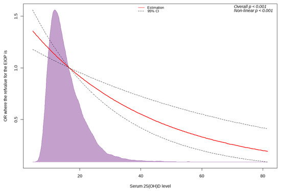A cubic spline curve revealed a significant inverse relationship between serum 25(OH)D levels and the OR for EIOP (Figure 3). As serum 25(OH)D level increased, the risk of EIOP decreased (overall p < 0.001).