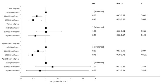 Figure 4 shows the results of the subgroup analyses by sex and age group. In the male subgroup, the fully adjusted ORs (95% CI) for EIOP in the 25(OH)D insufficiency and 25(OH)D sufficiency groups were 0.63 (0.47–0.85) and 0.49 (0.29–0.82), respectively. In the young age subgroup, the fully adjusted ORs (95% CI) for EIOP in the 25(OH)D insufficiency and 25(OH)D sufficiency groups were 0.69 (0.53–0.90) and 0.46 (0.30–0.72), respectively. In the female and elderly subgroups, the 25(OH)D status exhibited no significant relationship with EIOP. In the female subgroup, the fully adjusted ORs (95% CI) for EIOP in the 25(OH)D insufficiency and 25(OH)D sufficiency groups were 1.01 (0.62–1.64) and 0.58 (0.28–1.17), respectively. In the elderly subgroup, the fully adjusted ORs (95% CI) for EIOP in the 25(OH)D insufficiency and 25(OH)D sufficiency groups were 1.27 (0.57–2.81) and 0.77 (0.22–2.74), respectively.