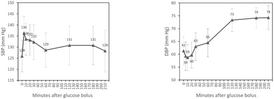 SBP significantly increased after 5, 10, and 20 min of glucose bolus (p < 0.001, p = 0.003, p = 0.023, respectively) compared to the time of glucose injection (T0). A statistically significant rise of DBP after 2 and 3 h (p < 0.001, p < 0.001) and also at the end of dialysis (p < 0.001) was observed. HR increased significantly after 3 h of the glucose bolus (p = 0.027) and at the end of the experiment (p = 0.002). PP increased after 5, 10, and 20 min of the glucose bolus (p < 0.001, p < 0.001, p = 0.002, respectively) and fell significantly after second hour (p = 0.037) and third hour (p = 0.019) and also at the end of the experiment (p = 0.002). We observed a statistically significant increase of MAP after 2 and 3 h of glucose injection (p < 0.001, p = 0.001) and at the end of the experiment (p = 0.003) (Table 2). However, MANOVA for repeated measurements showed overall changes in the course over time only for DBP, HR, PP, and MAP (Figure 1).