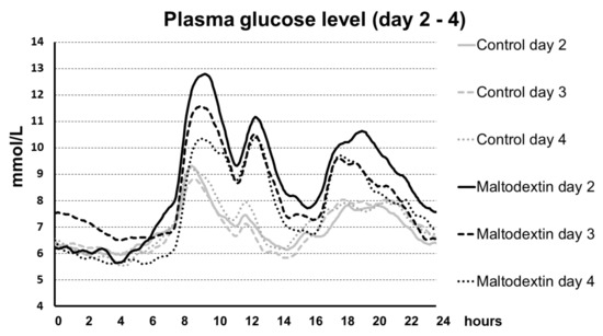 In addition, the areas under the glycemic curves were higher in T2DM and always increased further after maltodextrin administration in comparison with subjects without diabetes during days 2–4. However, in these patients the significant increase in glycaemia due to added CHO (maltodextrin) was diminished after four days and the effect was absent during days 5–7 (see Figure 3).