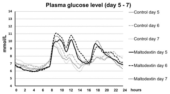 Plasma glucose level during days 5, 6, and 7 in T2DM patients during control period and during maltodextrin administration. It is apparent that the postprandial peak hyperglycemia was blunted in comparison with days 2–4.