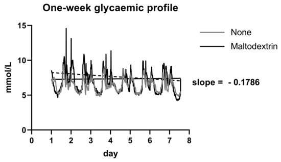 One-week glycemic profile: the patients receiving maltodextrin had higher glycaemia during the postprandial period. This phenomenon was significantly blunted in latter half of the follow-up and the glycaemia in this cohort had a decreasing tendency (slope of −0.1786; p < 0.0001).