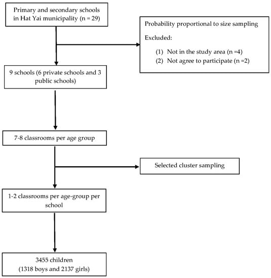 A cross-sectional study was conducted from June 2011 to March 2012 in nine primary and secondary schools (six private schools and three public schools) in the Hat Yai municipality of southern Thailand, which were randomly selected by probability-proportional-to-size sampling from the 29 schools in this area. One to two classrooms in each age group were randomly selected using cluster sampling of classrooms from the school (Figure 1). A total of 3455 Thai schoolchildren (1318 boys, 2137 girls) aged 6–18 years were recruited for the study following contact with the school by the researchers. Children and adolescents with weights and heights between the 2.5th and 97.5th percentiles were selected. Those whose weight and height were lower than the 2.5th percentile or higher than the 97.5th percentile were removed as outliers to ensure homogeneous data distribution. Assent and informed consent were obtained from all the children and their parents. The study protocol was approved by the Institutional Review Board and the Ethics Committee of the Faculty of Medicine, Prince of Songkla University (EC 54-069-01-1-3-2).