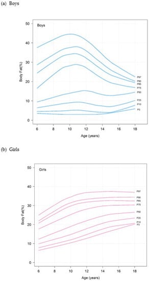 Differences in body composition may exist in different ethnic groups owing to the effects of environmental and genetic differences that are specific to different populations [10]. Body-fat reference curves have been constructed for many countries; however, data on Thai reference values for body fat in children are scarce and body-fat reference curves for Thai children have never been constructed. Therefore, the present study was carried out with the primary aim of generating sex-specific percentile curves for PBF in Thai children aged 6–18 years old using BIA analysis to assess children’s adiposity. The secondary objective was to determine the association between body fat and BMI and between body fat and the waist-to-height ratio (WHtR).