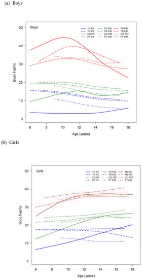 In our Thai girls, the 50th- and 97th-percentile curves were similar to those of the countries noted above and increased with age [10,15,16]. Both percentile curves of the Thai girls were significantly lower than those of the Turkish, Colombian and Portuguese girls at 6 years of age but progressively increased and overlapped with the corresponding the 50th-percentile curves for the Turkish and Colombian 14- and 15-year-olds, as well as with the 95th-percentile curves for the 9- and 10-year-olds, respectively; they were then slightly higher than the Turkey and Colombia curves after these ages. The 50th- and 97th-percentile curves of the Thai girls were significantly lower than those of the Portuguese girls at 6 years of age but progressively increased and later became slightly lower than those of the Portuguese adolescents at 14 and 12 years of age, respectively. The 3rd-percentile curves of PBF in the Thai girls increased for all ages; however, the 3rd-percentile curves for Turkey, Colombia and Portugal were fairly stable or slightly decreased for all ages. When we compared the 3rd-percentile curves in the female children, the curve of the Thai girls was significantly lower than that of the Turkish, Colombian and Portuguese girls at 6 years of age but progressively increased and overlapped the corresponding Colombian, Turkish and Portuguese curves at 11.5, 14.5 and 16 years of age, respectively, after which it became higher than these curves. Additionally, the patterns of all the percentile curves of PBF of the Thai girls were close to those of the Hong Kong and Indian girls, which are Asian populations, although these Asian curves were assessed using other brands of BIA instruments [17,18].