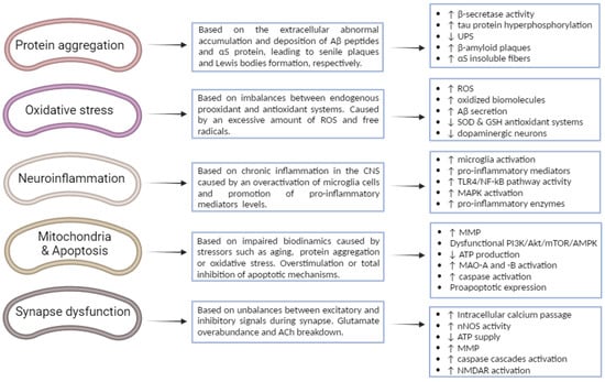 Molecular mechanisms in neuropathologies still represent a complex field of research due to limited knowledge, low financial resources and difficulties in accessing the human brain [8]. However, through in vivo and animal models it has been possible to decipher different questions. There is a common belief that CNS degradation is closely related to abnormal misfolding, protein deposition and, eventually, neuronal death [25]. However, protein aggregation triggers other processes that also contribute to neuronal, synaptic and cognitive deterioration, always regulated by genetic, environmental and endogenous factors related to aging [26]. Main key biological mechanisms observed are neuroinflammation, oxidative stress and increased free radical formation, excitotoxicity, impaired bioenergetics, mitochondrial dysfunction and unbalanced cell apoptosis [17,25]. Thus, neurodegeneration can be considered a multifactorial cyclical problem.