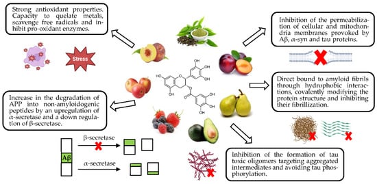 Phenolic compounds have been shown to prevent protein deposition through numerous mechanisms, using one or more at a time. For example, EGCG has been theorized to protect against protein misfolding through antioxidant properties, degrading APP by α-secretase into non-amyloidogenic proteins, direct binding to the protein avoiding its fibrillization, or even preventing tau aggregation and hyperphosphorylation [9,132,133]. Different mechanisms reported for this compound are gathered in Figure 3.