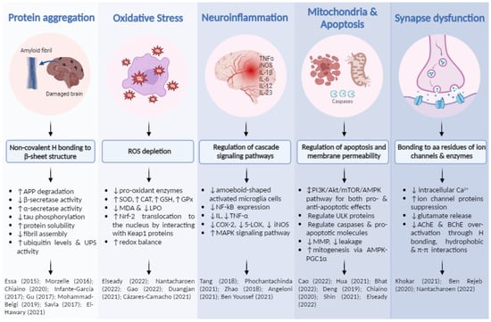 Some studies were conducted ex vivo, recollecting brain tissue after the consumption of the studied extract, such as Phachonpai et al. (2021), who used wampee fruit peel to attenuate memory deficits in rats and showed that cognitive impairment was reduced by its supply [106]. Main mechanisms and biological processes are gathered in Figure 4.