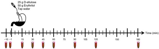 The study used a double-blind, placebo-controlled, cross-over design and was conducted between September 2019 and September 2020. Part of the results and the sample of this study were reported elsewhere [14]. Each subject took part in three separate study visits as follows: 25 g D-allulose, 50 g erythritol or 300 mL tap water (placebo). The solutions were dissolved in 300 mL tap water. The rationale for the doses was chosen for the primary outcome of this study (GI satiation hormone release) and was based on the following considerations as previously described [14]: 50 g erythritol induces CCK, GLP-1, and PYY release reliably without GI side effects and corresponds to around 33.5 g of sucrose typically found in sweet beverages [22]. The effect of D-allulose on GI satiation hormones was not investigated before in humans. The recommended maximal single dose–where no GI side effects are observed–is 25 g [27]. The order of the study visits was randomized and counterbalanced among subjects. The study visits took place at least three days apart and after a 10-h overnight fast. All study visits started at ~0830 in the morning and, upon arrival, a cannula was inserted into a forearm vein for blood collection. Next, a nasogastric feeding tube (external diameter of 8 French) was inserted into the stomach. The rationale for intragastric administration of the solutions was to bypass oro-sensory exposure (e.g., taste and intensity) directly affecting brain mechanisms that may influence physiological/endocrine responses [28,29].
