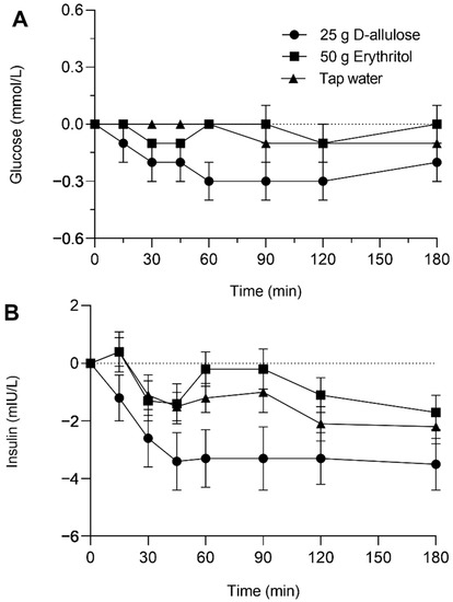 Glucose (A) and insulin (B) concentrations in response to intragastric administration of solutions containing 25 g D-allulose, 50 g erythritol or tap water to 18 healthy subjects. Data are expressed as mean ± SEM, and changes from baseline values are shown.