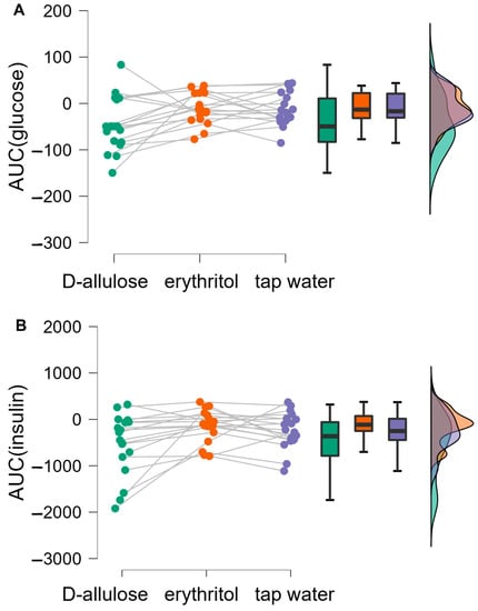 Raincloud plots showing the Bayesian repeated measures ANOVA on the AUC of glucose (A) or insulin (B) concentrations in response to the intragastric administration of solutions containing 25 g D-allulose (green), 50 g erythritol (orange) or tap water (purple) to 18 healthy subjects.
