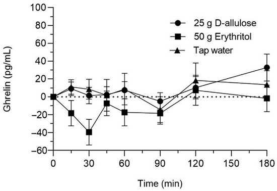 Ghrelin concentrations in response to intragastric administration of solutions containing 25 g D-allulose, 50 g erythritol or tap water to 18 healthy subjects. Data are expressed as mean ± SEM, and changes from baseline values are shown.