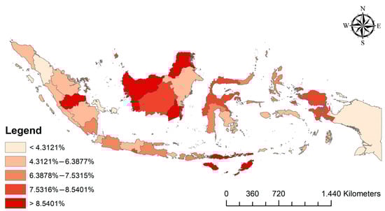 The national average percentage of LBW was 6.981% (95% CI 6.607–7.355%). At least 18 out of the 34 provinces in Indonesia have LBW rates above the national average. Figure 1 shows the percentage distribution of LBW cases by the provinces in Indonesia. The areas with a high percentage of LBW cases tended to be in the Northern Central parts of Indonesia.