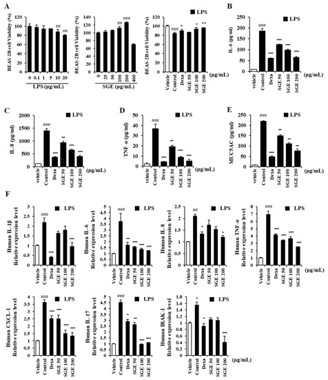 The secretion of IL-6, IL-8, TNF-α, and MUC5AC, measured by ELISA, in LPS-stimulated BEAS-2B cells, decreased significantly with SGE incubation or with dexamethasone (p < 0.01, and p < 0.001; Figure 1B–E). We performed RT-qPCR to identify the activity of SGE on the expression of genes for pro-inflammatory cytokine and IRAK1 (Figure 1F). The expression of pro-inflammatory cytokines IL-1β, TNF-α, IL-8, IL-6, and IL-17 was significantly inhibited by SGE (p < 0.05). The expression of the genes for chemokine CXCL-1, related to neutrophil trafficking, and IRAK1, related to the expression of inflammatory genes, was also reduced by SGE ((p < 0.001).