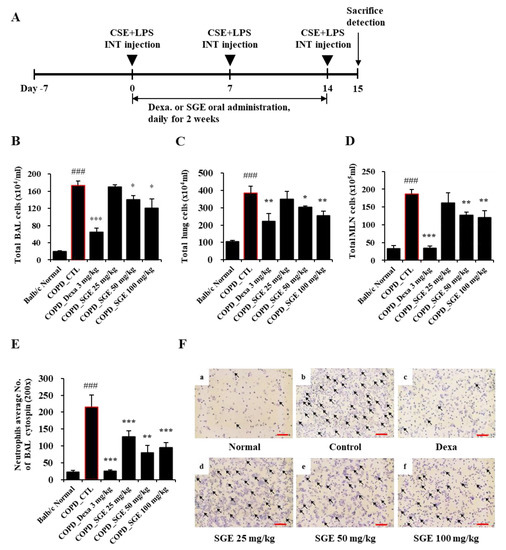Effects of SGE on the number of airway immune cells and neutrophilic airway inflammation in CSE/LPS-induced COPD murine model. (A) Schematic diagram of CSE/LPS-induced COPD model in mice. (B) The total number of cells in COPD-induced BALF in each treatment group. (C) The total number of cells in the lungs of COPD-induced mice in each treatment group. (D) The total number of cells in COPD-induced MLN in each treatment group. (E) The number of neutrophils in BALF was counted using a hemocytometer. (F) Photomicrograph of BALF cytospins from COPD model mice treated with CSE/LPS (magnification, 200×) by differential leukocyte staining. Neutrophils are indicated by arrows. Scale bar = 100 µm. The data are presented as means ± SEM (n = 6 mice) for individual mice. ### p < 0.001 compared to normal, and * p < 0.05, ** p < 0.01, and *** p < 0.001 compared to control. Dexa, dexamethasone.
