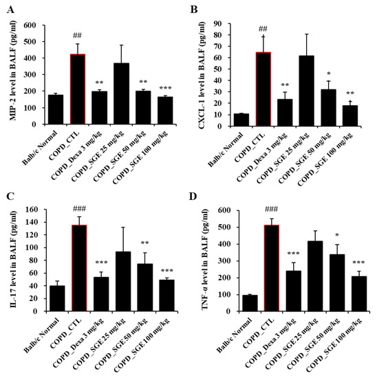 Effects of SGE on cytokine production in BALF of COPD-induced mice. Production of (A) MIP2, (B) CXCL1, (C) IL-17, (D), and TNF-α in BALF of COPD-induced mice was measured by ELISA. The data are presented as means ± SEM (n = 6 mice) for individual mice. ## p < 0.01, ### p < 0.001 compared to normal, and * p < 0.05, ** p < 0.01, and *** p < 0.001 compared to control. Dexa, dexamethasone.