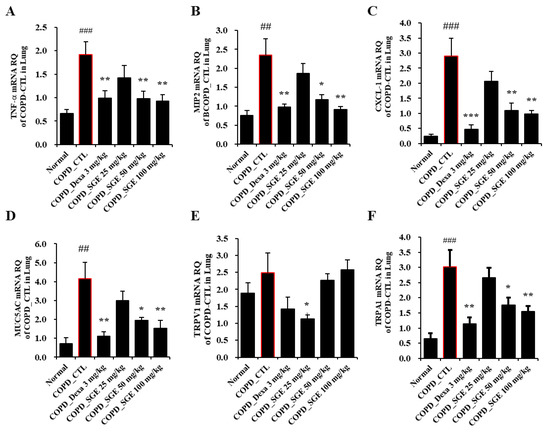 Cytokines TNF-α, IL-17, CXCL1, and MIP2, as measured by ELISA, increased in CSE/LPS-induced COPD mice but were decreased significantly by incubation with SGE (50 and 100 mg/kg) (p < 0.05, p < 0.01, and p < 0.001; Figure 4A–D). Expression of the genes encoding cytokines TNF-α, MIP-2, and CXCL1 in lung tissue, as measured by RT-qPCR, increased in COPD-induced mice (p < 0.05, p < 0.01, and p < 0.001; Figure 5A–C). The expression of the genes encoding TRPA1, MUC5AC, and TRPV1 was reduced significantly by SGE treatment (50 and 100 mg/kg) (p < 0.05, p < 0.01, and p < 0.001; Figure 5D–F). However, the expression of the gene for TRPV1 decreased significantly at 25 mg/kg SGE but not at higher concentrations (Figure 5E).