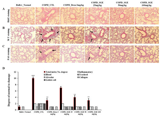 Effects of SGE on histopathological markers for lung tissue of COPD-induced mice. Lung tissue was sectioned in paraffin and stained for histological analysis. (A) H&E staining showing immune cell infiltration and the morphology of small airways. (B) M-T staining showing collagen fibers increased by pulmonary fibrosis. Black arrows indicate blue-dyed collagen fibers. (C) PAS staining showing hyperplasia of goblet cells in small airways. Black arrows indicate goblet cells. Scale bar = 100 µm. (D) Total index number were quantitated. The data are presented as means ± SEM (n = 6 mice) for individual mice. ### p < 0.001 compared to normal, and ** p < 0.01 compared to control. Dexa, dexamethasone.