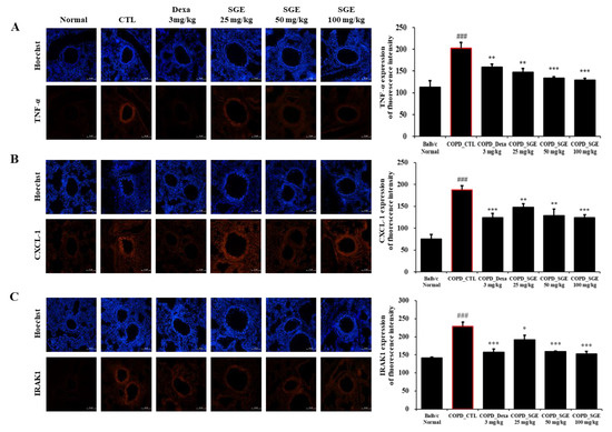 Effect of SGE on TNF-α, CXCL1, IRAK1 using immunofluorescence analysis of lung tissue from COPD-induced mice. Sectioned COPD-induced mouse lung tissue was stained with (A) TNF-α, (B) CXCL-1, or (C) IRAK1 antibodies and visualized as red fluorescence. Hoechst was used as a nuclear stain with blue fluorescence. Fluorescence for each factor is shown in a quantitative bar graph. Scale bar = 100 µm. The data are presented as means ± SEM (n = 6 mice) for individual mice. ### p < 0.001 compared to normal, and * p < 0.05, ** p < 0.01, and *** p < 0.001 compared to control. Dexa, dexamethasone.