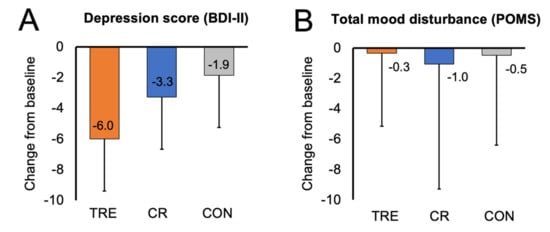 Change in mood scores by month 12. Data are included for 90 participants; means were estimated using an intention-to-treat analysis using a linear mixed model. Error bars indicate 95% confidence intervals for each parameter from baseline by diet group. (A) Change from baseline to month 12 in depression score (measured with BDI-II survey). (B) Change from baseline to month 12 in total mood disturbance score (measured with SF-36 survey). Abbreviations. BDI-II: Beck Depression Inventory II; CON: control; CR: calorie restriction; POMS: Profile of Mood States survey; TRE: time-restricted eating.
