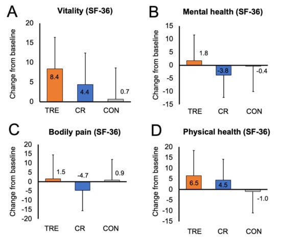 Changes in quality of life are presented in Table 2 and Figure 2. At baseline, the SF-36 constructs of vitality, mental health, bodily pain, and general physical health were all moderately high in the TRE, CR, and control groups. This would indicate overall good quality of life in all groups at the beginning of the study. After 12 months of intervention, there were no significant changes in mental health, bodily pain, and general physical health in the TRE or CR groups versus controls. However, there was a trend towards increased vitality in the TRE group (7.77 [95% CI: 0.15, 15.39] p = 0.05), relative to controls.